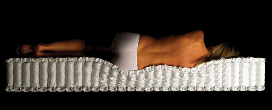 The progressive load-bearing system is composed of triple overlapping layers of steel springs, each of them enclosed in a bag and reacts independently: the first and the third 4 cm layer welcomes and supports our body exercising a reactive function that fosters a progressive welcome on the vertebral column and limbs, limiting any type of compression; the middle layer, which a thicker and stiffer Flexizone system, supports the pelvis and the shoulder area.